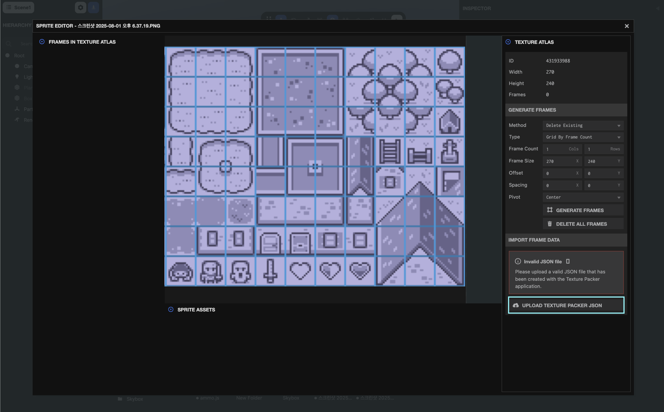 이렇게 하면 스프라이트 에셋을 만들 수 있는 텍스처 아틀라스에 프레임이 생성됩니다.